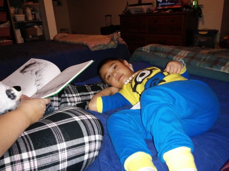 A very tired Patrick listening to our Christmas story.