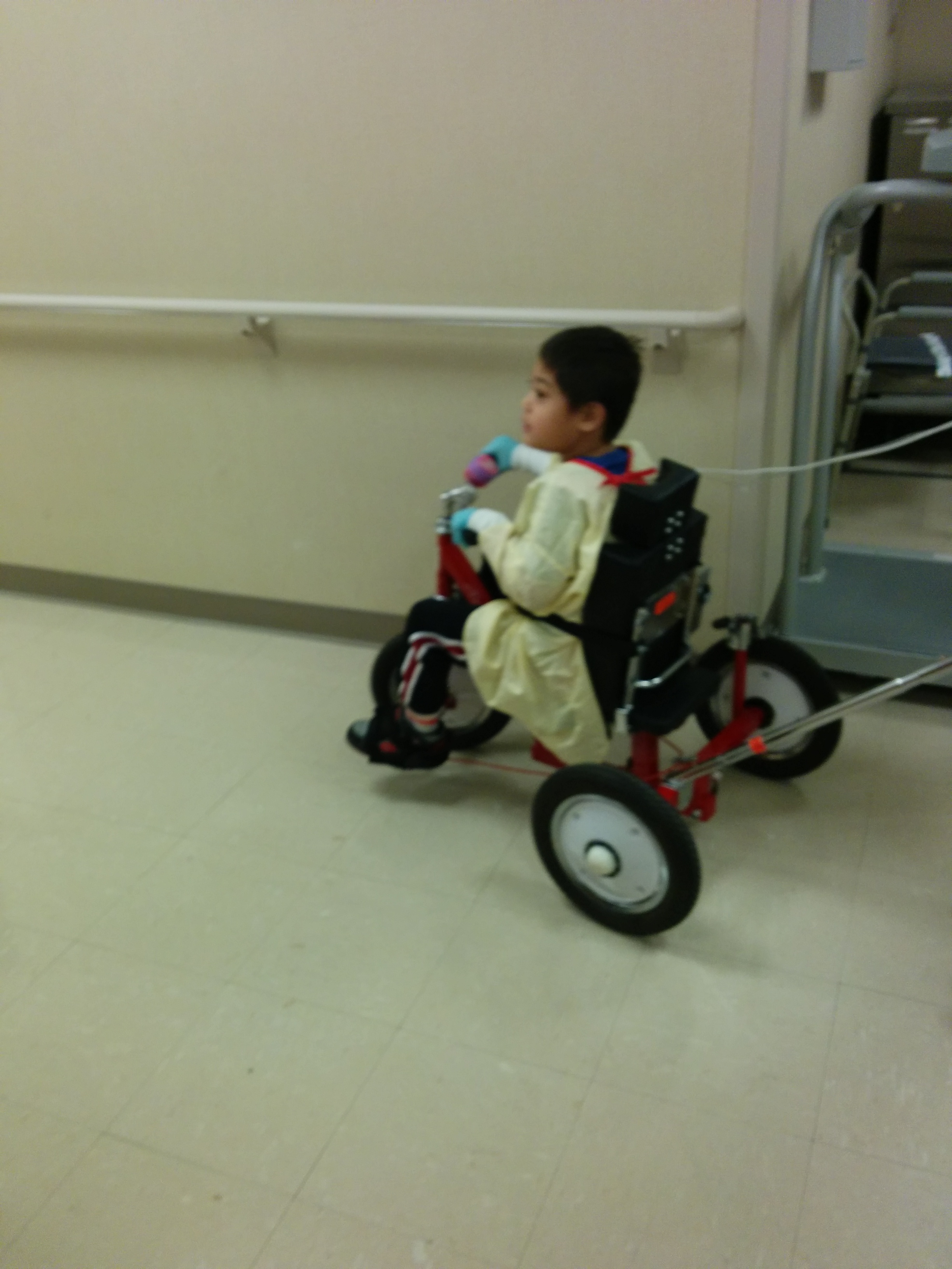 Previous Image Next Image IMG_20150129_144410 Patrick riding a bike with PT. Wearing gloves and gown to prevent spreading germs