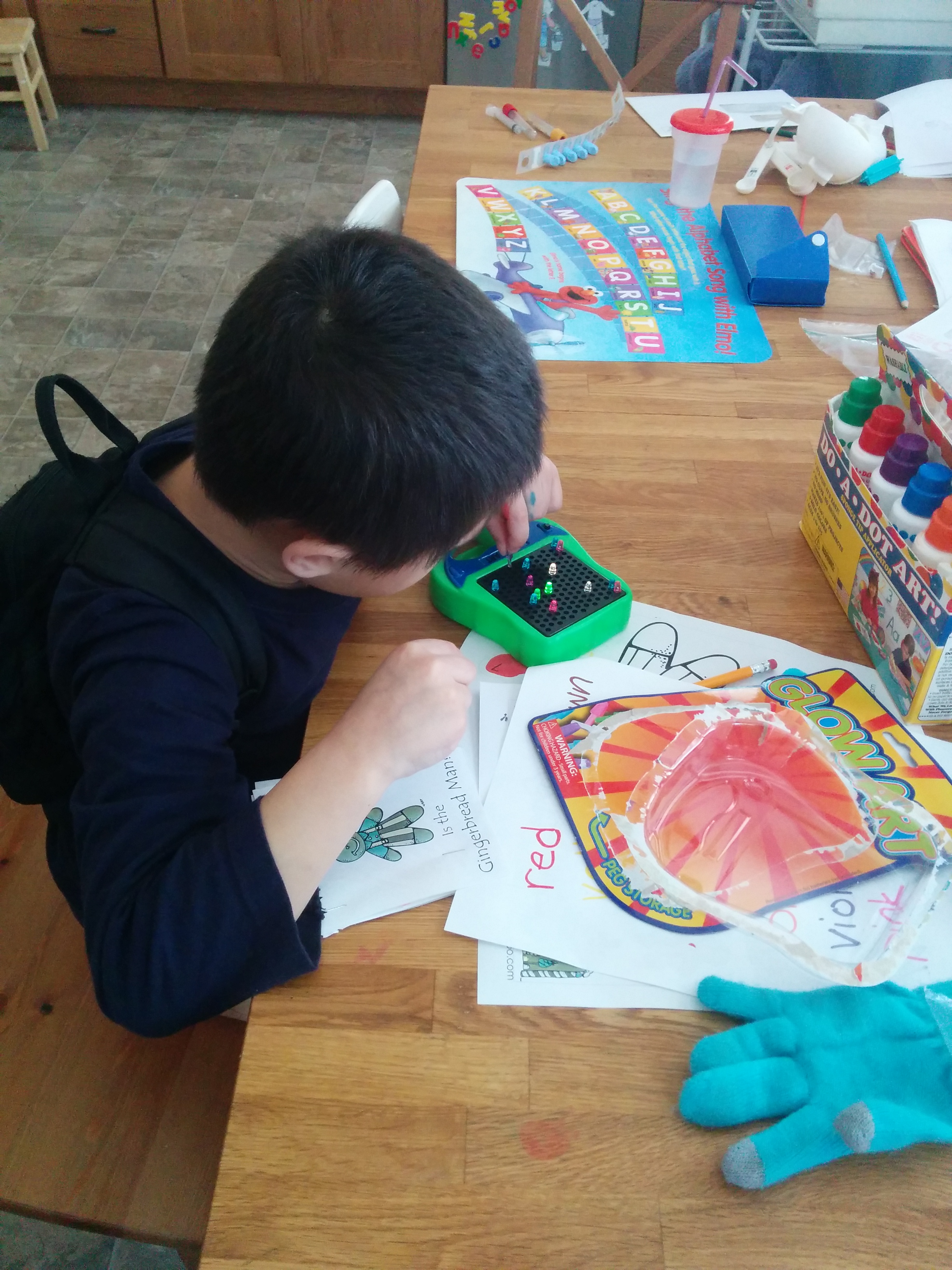 All told, Patrick got to decorate a Santa hat, make a bracelet, make a jingle bell shaker, paint some pictures, and just generally play with toys. Then he came back to the room and was ready for some myself time and spent another hour playing with playdough.