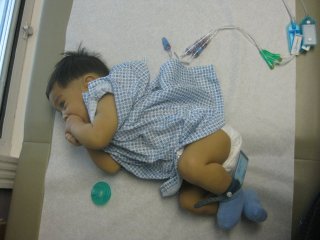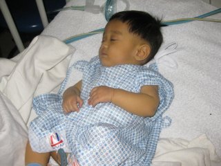 The surgery went well. Patrick woke up and was able to come off the ventilator in no time at all. He was, as always, a favorite with the nurses in post-op. Brian got to reconnect his TPN in post-op, which was kind of funny to do. Our nurse was fascinated with the different equipment. We got some curious looks as Brian drew up vitamins with syringes and injected them into the IV bags.