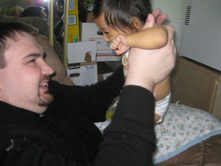 Patrick learned to laugh a while ago, but we didn’t get out and out chuckles until we discovered that the kid who used to scream his head off whenever he got undressed is ticklish and loves to have his clothes off. Dressing and especially weighing are now favorite games… but it’s best when daddy just picks him up without clothes on and tickles his back.