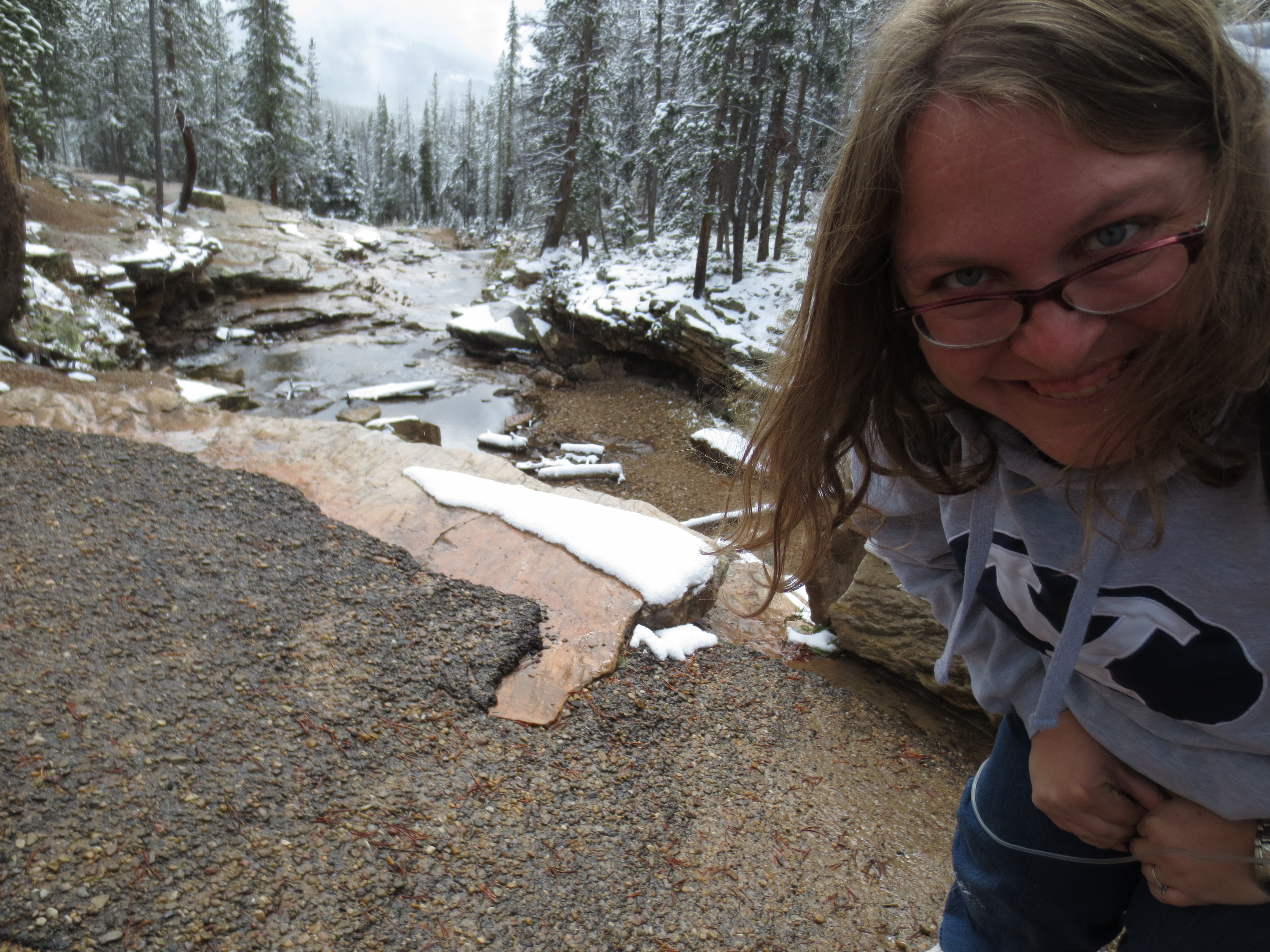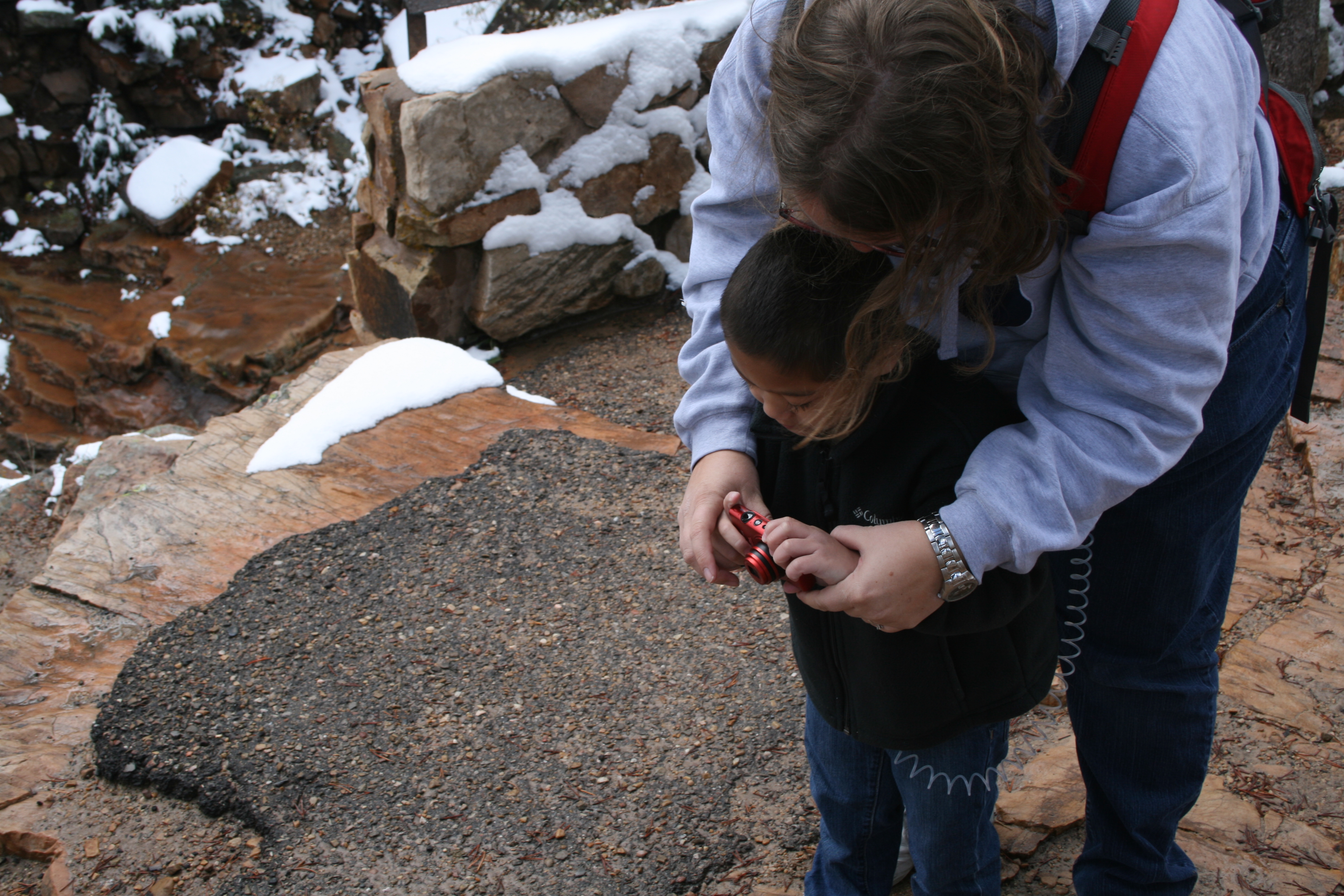 On Sunday evening, I packed him a cup of veggie straws and we went for a drive. He finished his cup after 10 minutes and asked to go back home for more. I didn’t oblige. Instead, we went to drive across the “Mormon Bridge” just cuz we’d heard about it. Then, as I was driving back, I noticed signs for the “Lewis and Clark Monument” outside of Council Bluffs, Iowa. So, we went over there. Arrived just as the sun was setting, reflecting in the Missouri River. Being in a state park, on a hill overlooking the city.. felt a bit like home. Patrick was just happy to wear his snowboots and stomp in snow and mud.